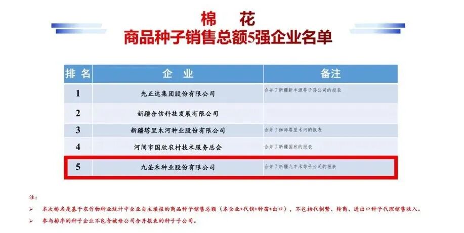 近日,第二十二届全国种子双交会发布权威数据,九圣禾种业股份有限公司2024年度种子销售总额位列全国第八,并以小麦第四、棉花前五、玉米跻身前十的亮眼成绩,展现了九圣禾在多作物领域的全面突破。接下来和小编一起走进这扇聚焦种业企业发展成果的专业展示窗口,探寻这份亮眼成绩单背后的技术沉淀与发展答卷。